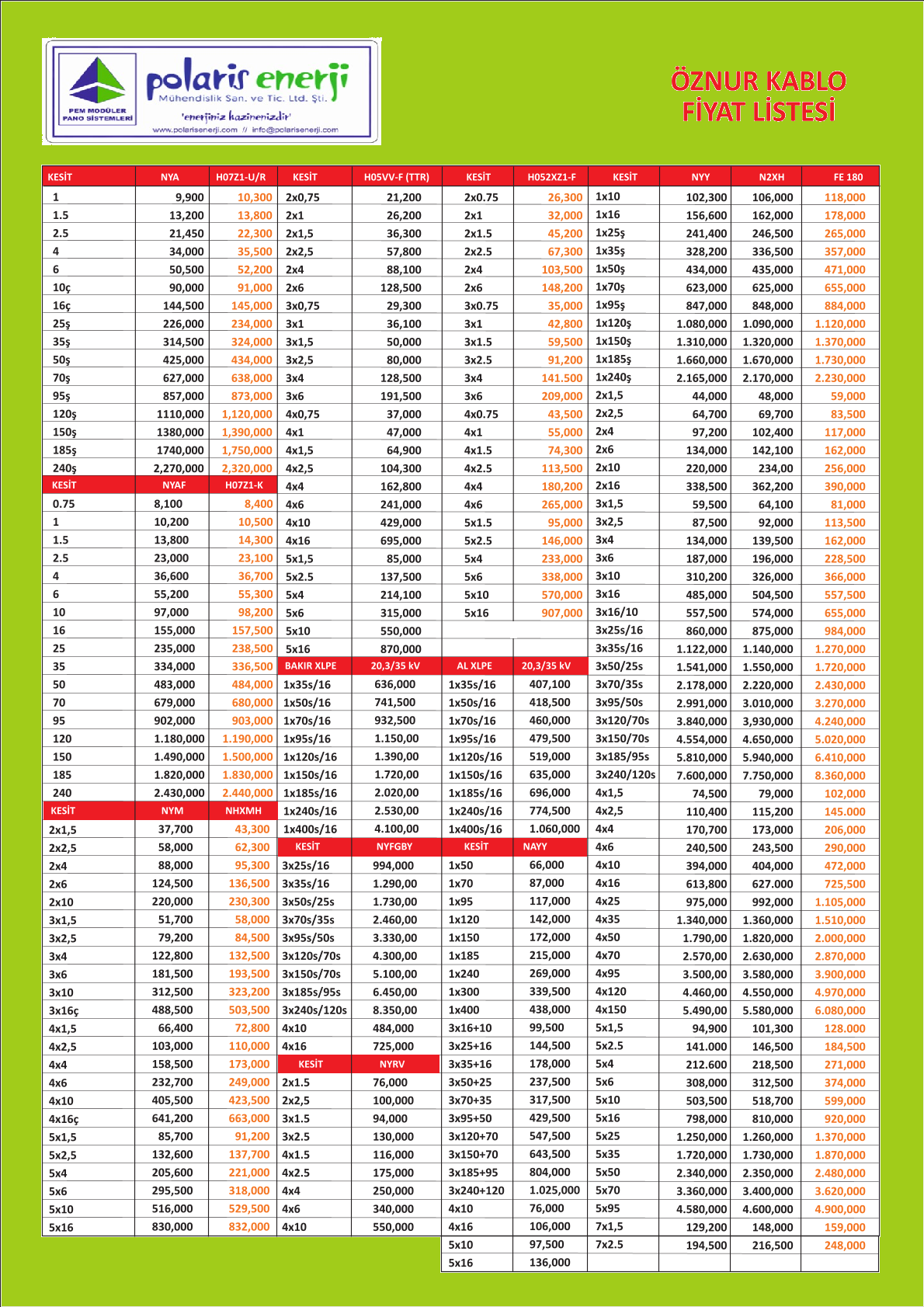 Öznur Kablo Fiyat Listesi 2025